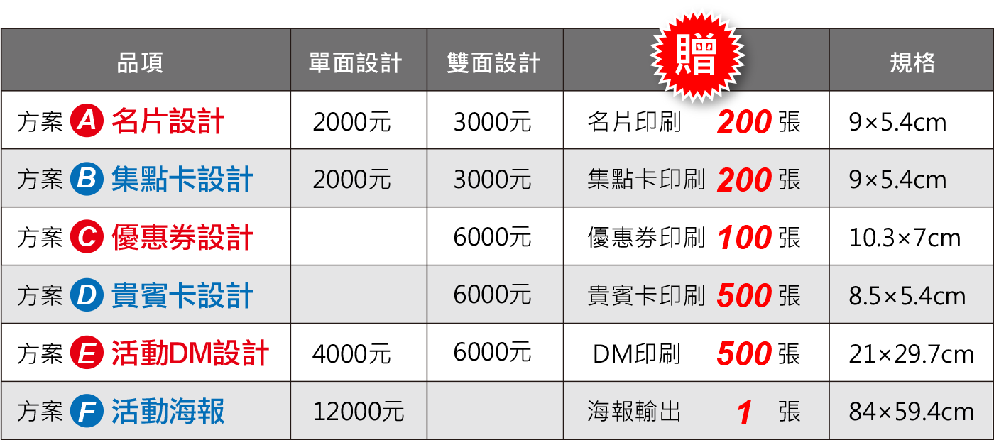 | 紙材(任選一款) | 規格 | 數量 | 單面總價 | 雙面總價 |